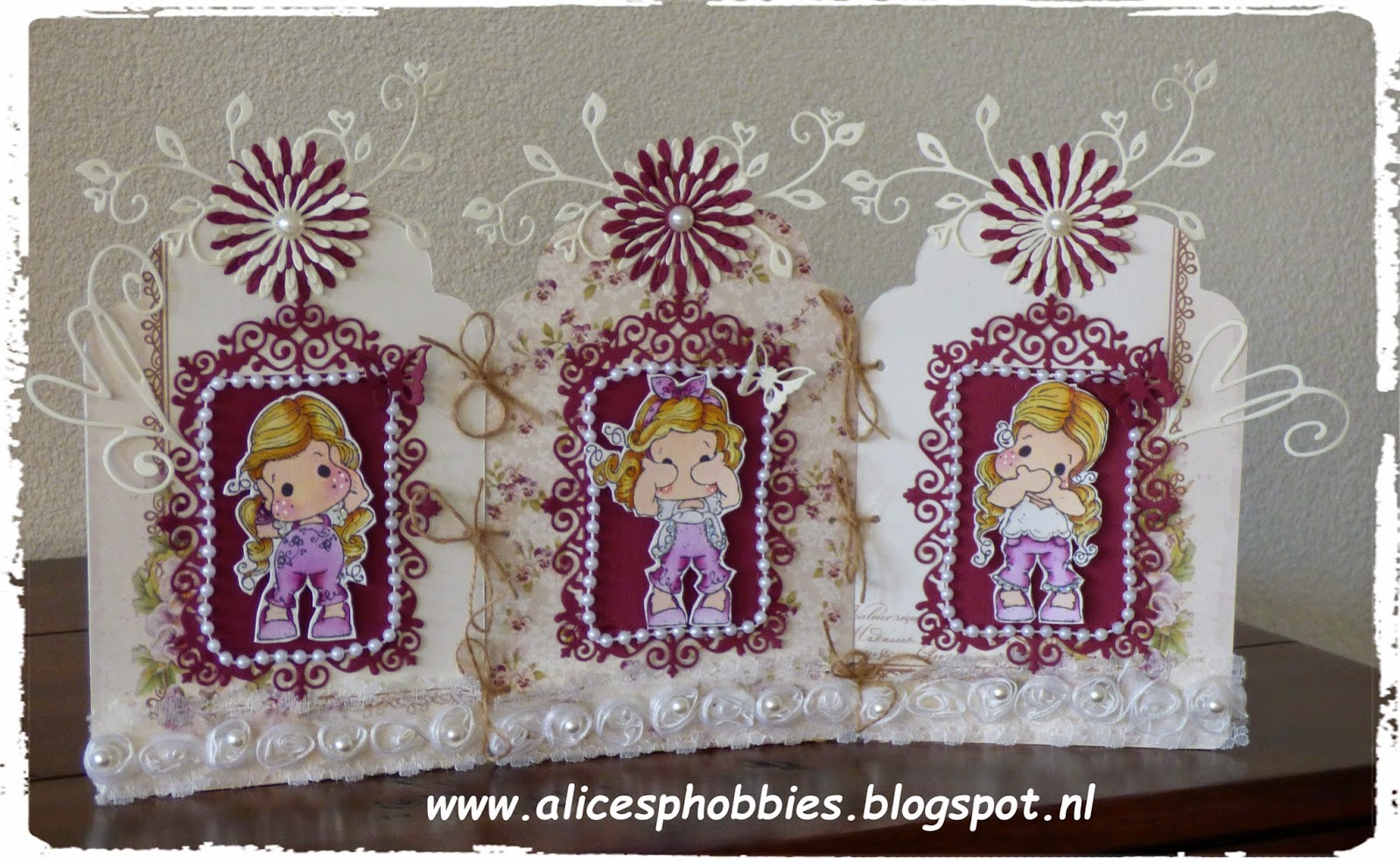 Tussen alle kerstkaarten door heb ik het drieluikje van Let's get Bizzee versierd. Voor het drieluikje heb ik de horen, zien en zwijgen Tilda's uit de Pink Ribbon Donation gebruikt.